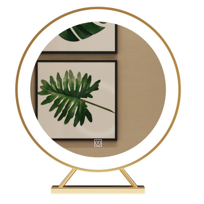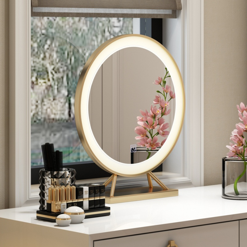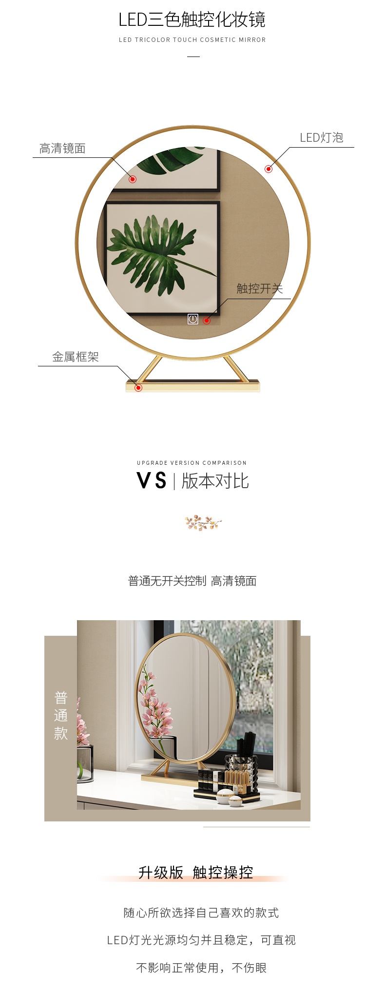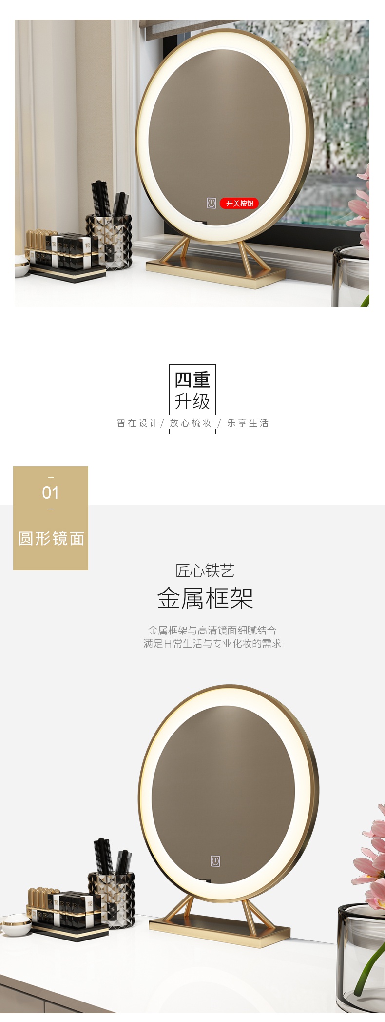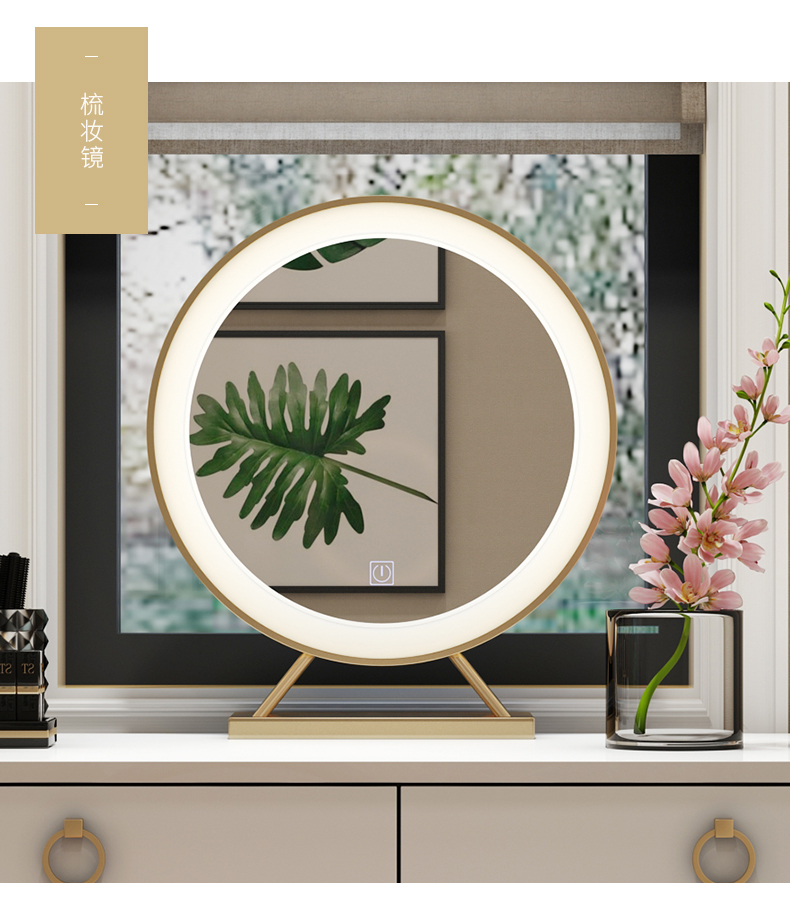 森美人北欧化妆镜金色圆形装饰镜台式座镜公主镜D灯镜子梳妆镜