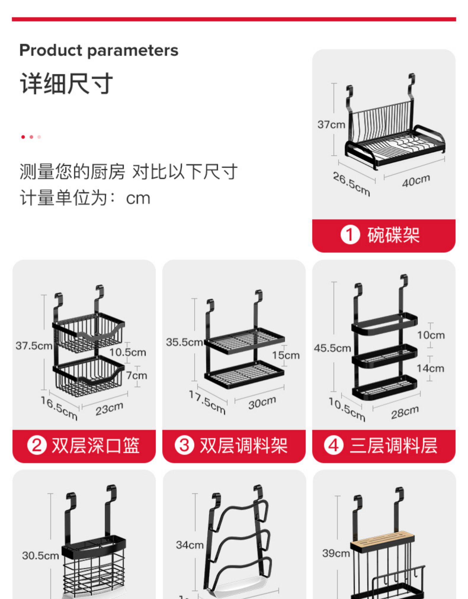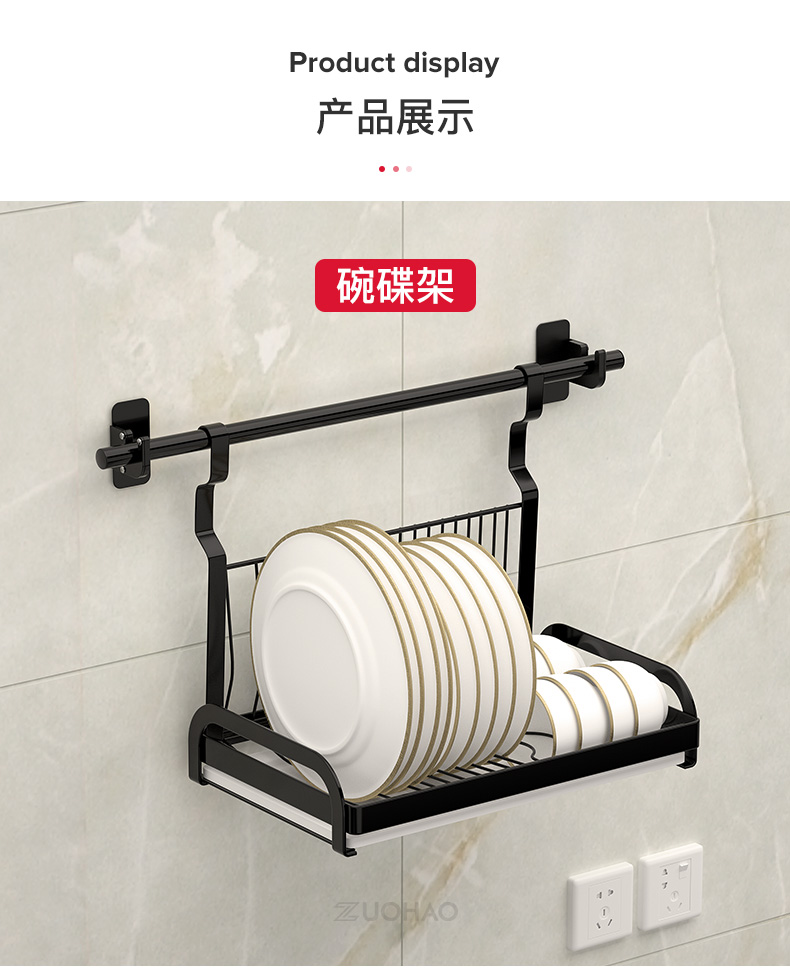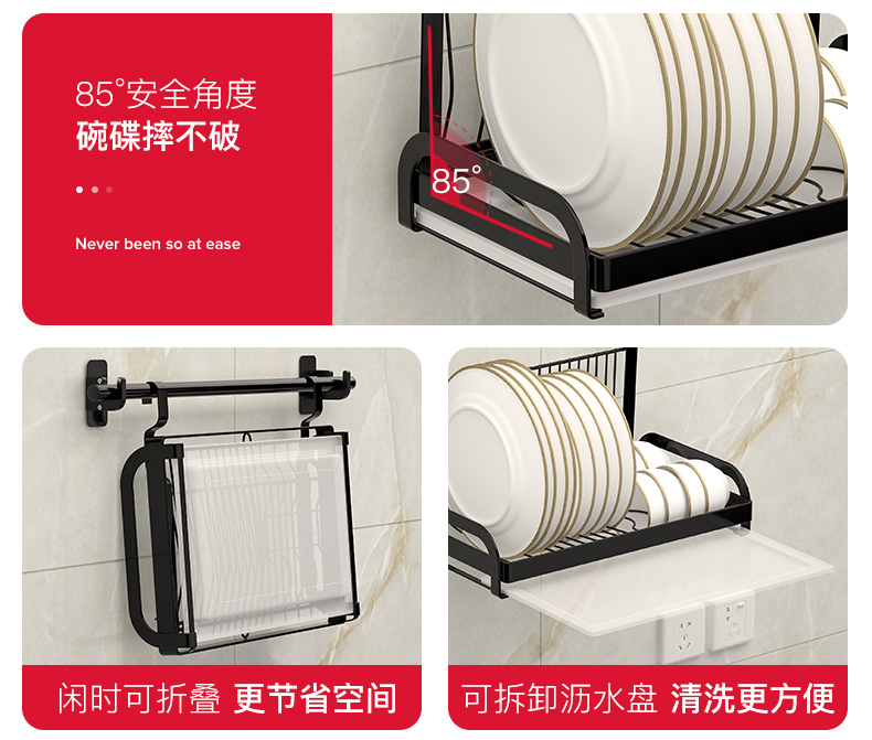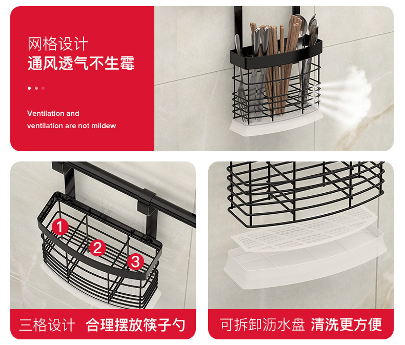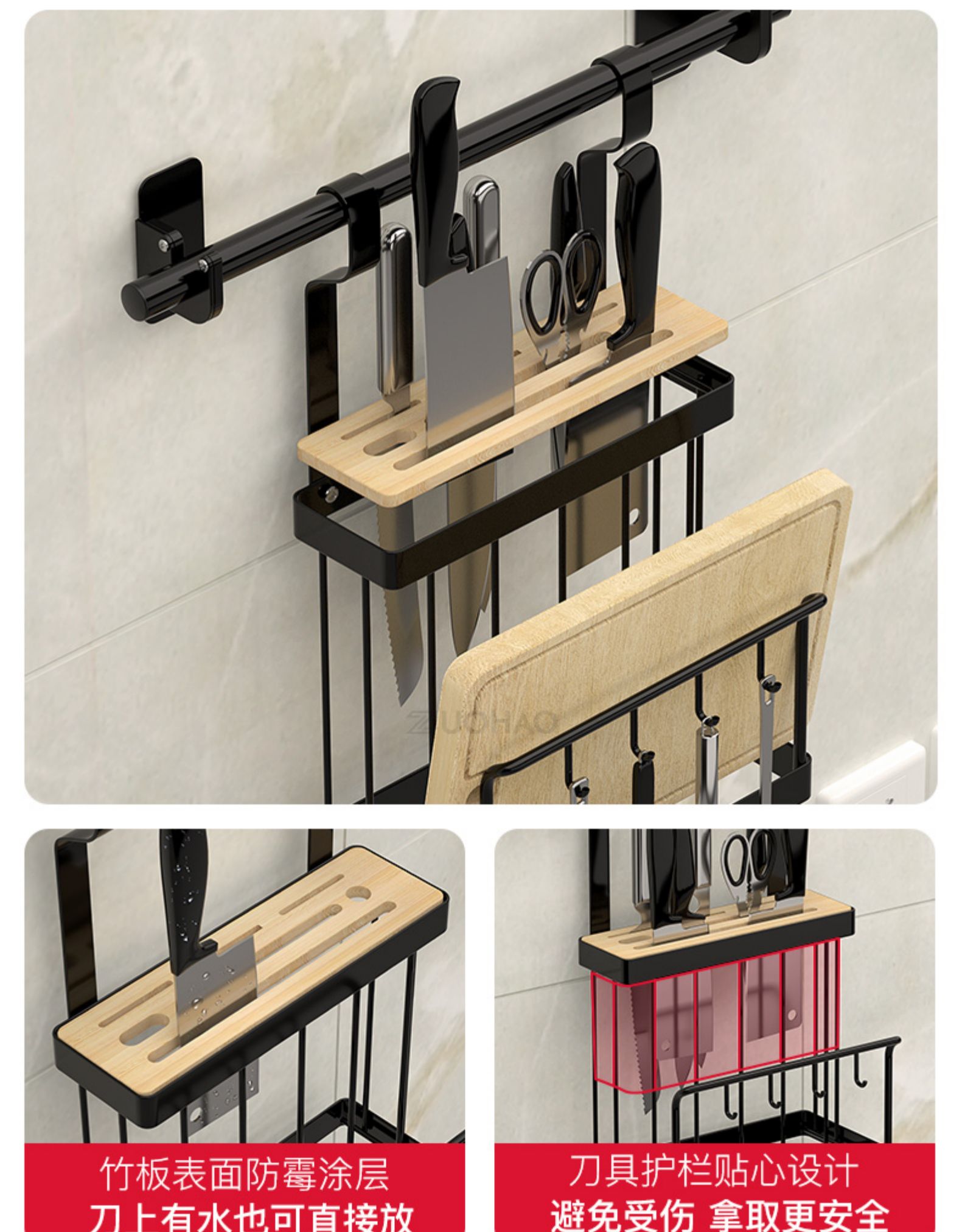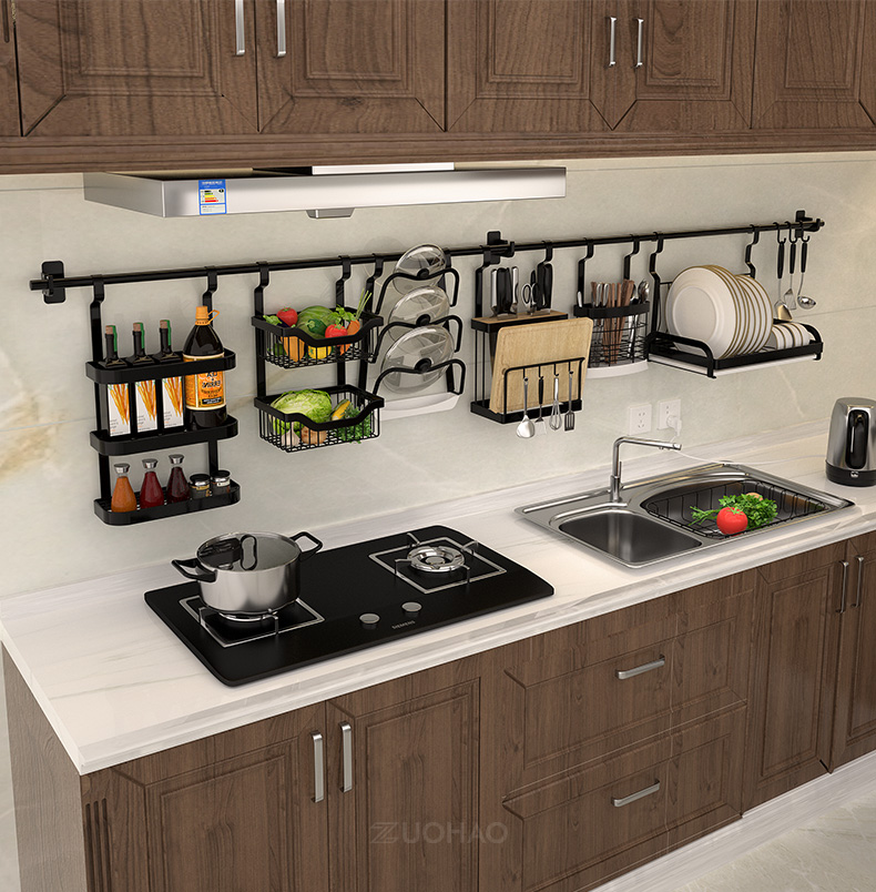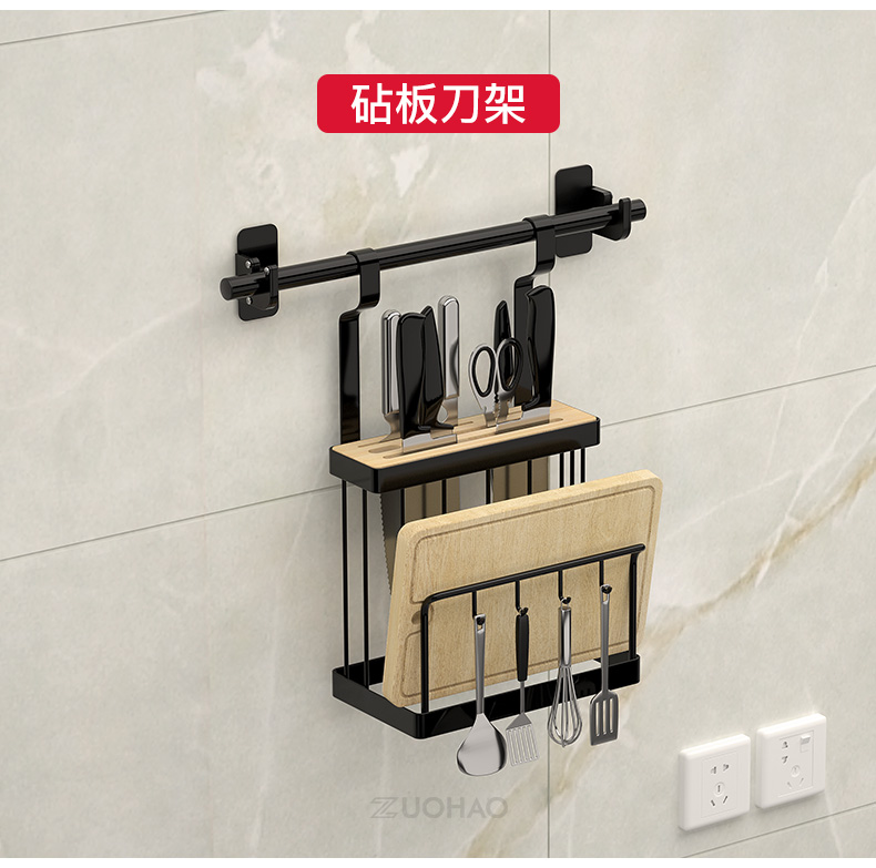 不锈钢免打孔厨房刀架厨房置物架用品收纳调味料架黑色挂架壁挂墙 三维工匠